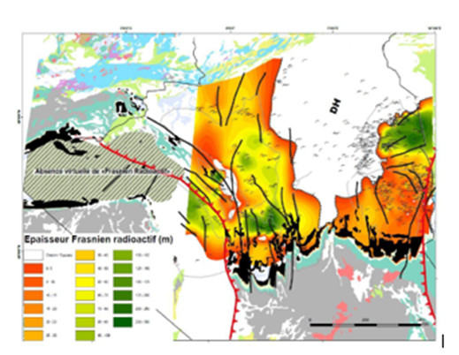 Carte d’épaisseur du Frasnien radioactif (étude Alnaft, réalisée par Beicip-Franlab).