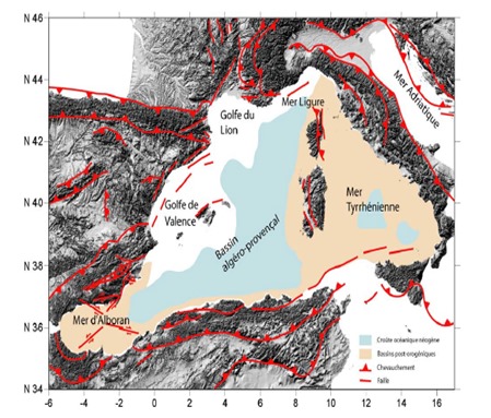 The Algerian-Provençal basin is the western basin of the Mediterranean, it is located on the convergence zone of the African and European tectonic plates. It is formed, during the Neogene distensive phase that affected the region, of pits that descend to 3,255 m, this basin has been interpreted as a rear-arch type extension basin. Its morphology is characterized by a very narrow continental shelf and a steep slope, its sedimentary cover mainly of Mid-Plio-Quaternary Age. It rests on a substratum of variable nature and origin (volcanic or metamorphic).